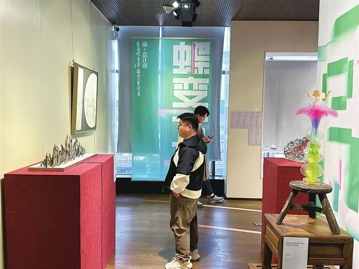 展覽分為“蝶美與共”“蝶舞共生”“蝶妙之門”“蝶變萬千”四個篇章,展現青年藝術家對江南文化的多元解讀。“本次展覽不僅是雕塑藝術的展示,更試圖構建一個‘可生長的江南意象’?!眳求野舱f?,F場,青年藝術家們運用金屬、玻璃鋼、樹脂等多元材料,以新穎的媒介與獨特的塑形語言,為理解江南、理解當下提供嶄新的視覺注解。